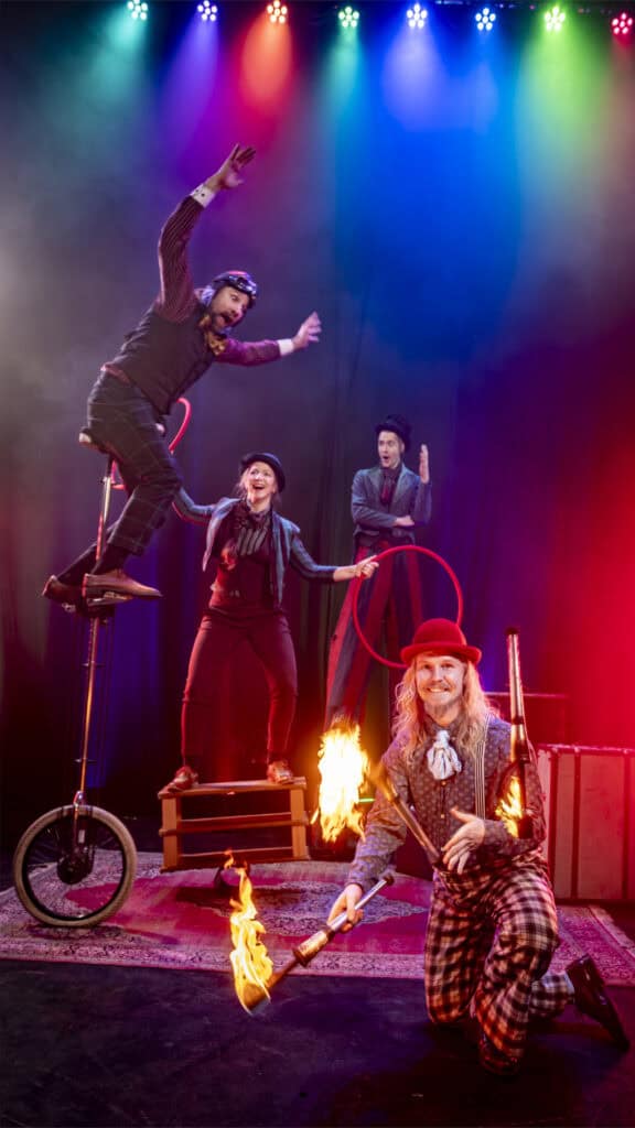 Föreställningen kan innehålla galen jonglering, trolleri, höga enhjulingar, fakir eller andra spektakulära cirkuskonster. Gyckel, gyckel, gyckel! är en föreställning som ser annorlunda ut varje gång den spelas men den har alltid samma element av improvisation, cirkus och humor.